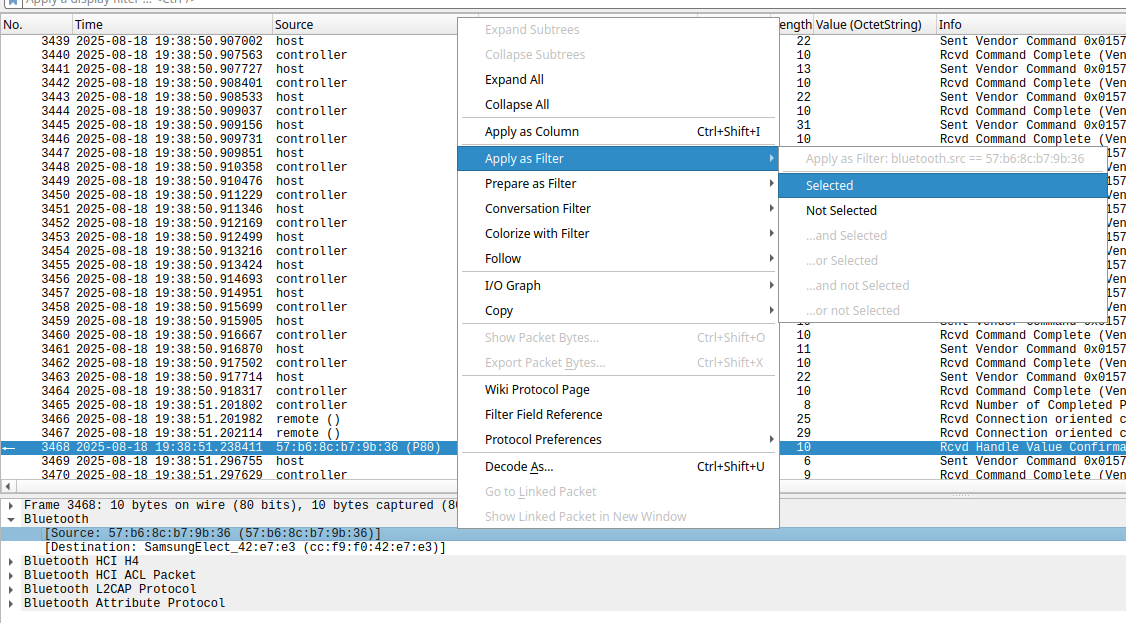 bluetooth.addr==DE:AD:CA:FE:BA:BE (from/to gadget)btatt (Bluetooth ATT payloads)