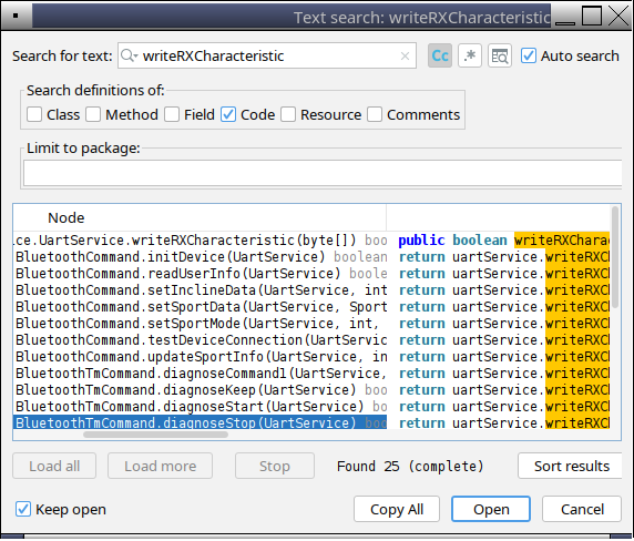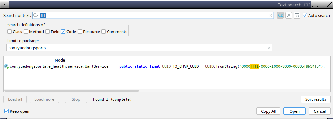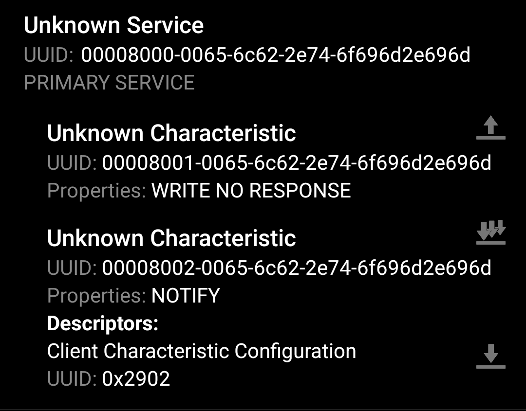 /* com.yuedongsports.e_health.service.UartService */ RX_CHAR_UUID = UUID.fromString("0000fff2-0000-1000-8000-00805f9b34fb"); TX_CHAR_UUID = UUID.fromString("0000fff1-0000-1000-8000-00805f9b34fb"); /* stripped irrelevant code, error handling, debug output */ public boolean writeRXCharacteristic(byte[] payload) { service = mBluetoothGatt.getService(RX_SERVICE_UUID); characteristic = service.getCharacteristic(RX_CHAR_UUID); characteristic.setValue(payload); mBluetoothGatt.writeCharacteristic(characteristic); }